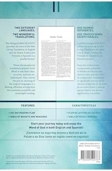 ¡Disfruta la Palabra de Dios en inglés y en español!Dos idiomas diferentes,dos traducciones excepcionales.La Biblia bilingüe NLT/NTV provee los textos de la New Living Translation en inglés y de la Nueva Traducción Viviente en español en un formato paralelo.Estas dos traducciones excepcionales presentan la Palabra de Dios en una manera clara, precisa y fácil de comprender. Transmiten el significado preciso de los idiomas originales en un estilo de escritura fluido y natural que promueve una lectura significativa y accesible.Esta Biblia incluye: Una página de presentación Un plan de lectura de 365 días Una tabla de pesos y medidas Tres mapas a todo color.